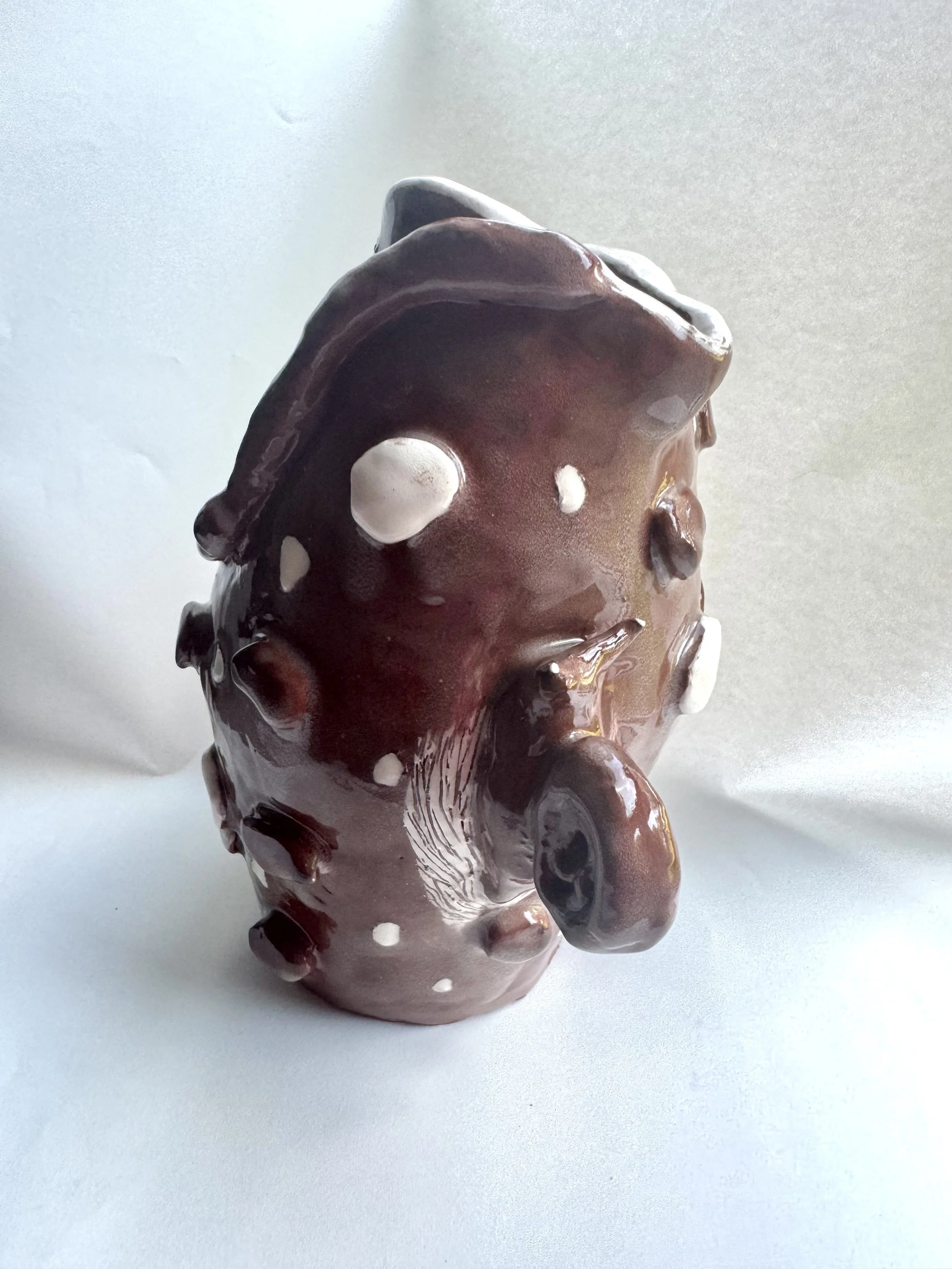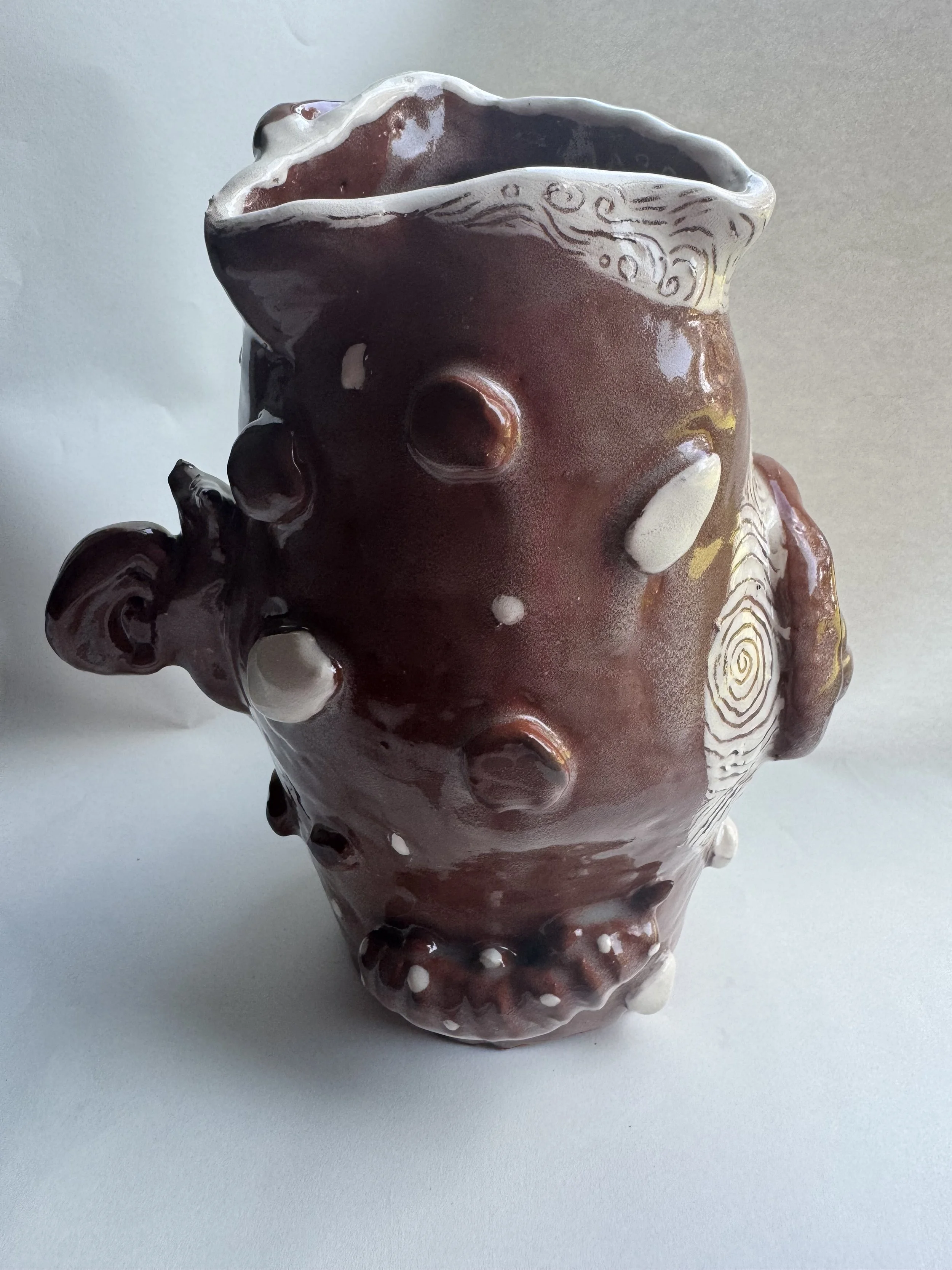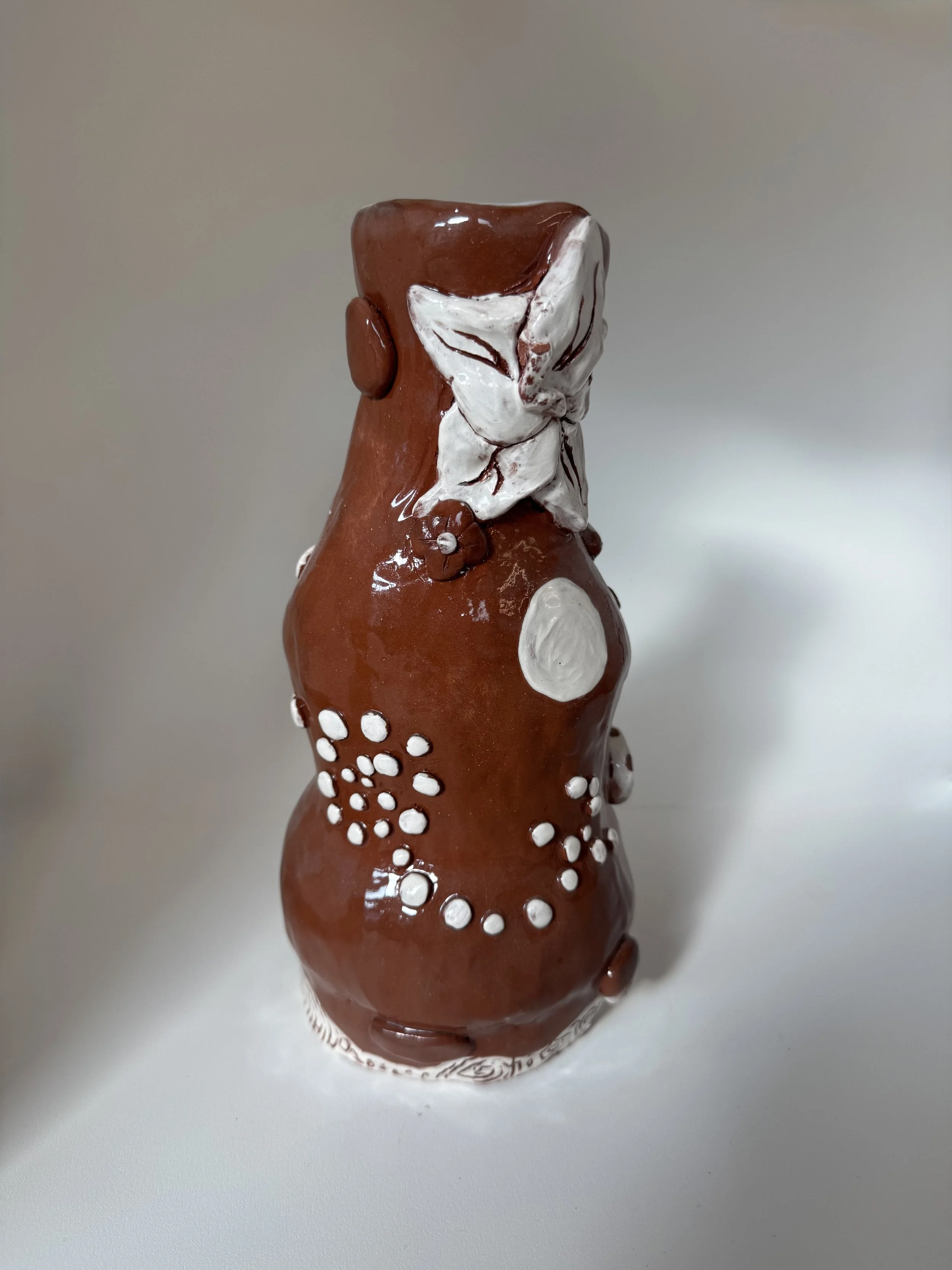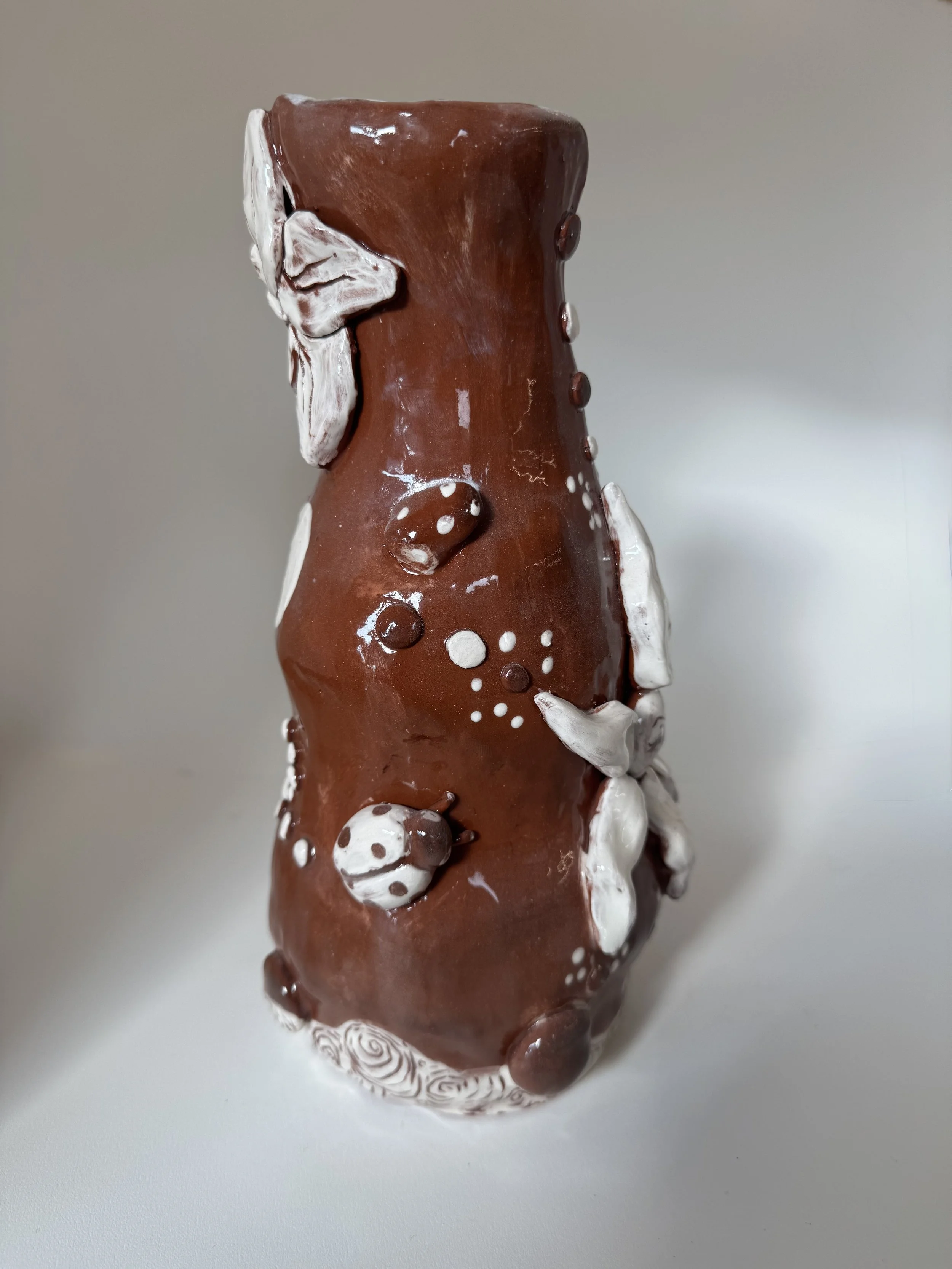 Inspired by a previous ceramic coil pot made in 2024 (Worms n Rocks), I focused on cleaner sgraffito, careful white slip application, and a simpler form, while still including some of the same elements. Such as the white pebbles, the white rim with sgraffito is not placed on the bottom, and different subjects, such as the sun, flower, and ladybug.